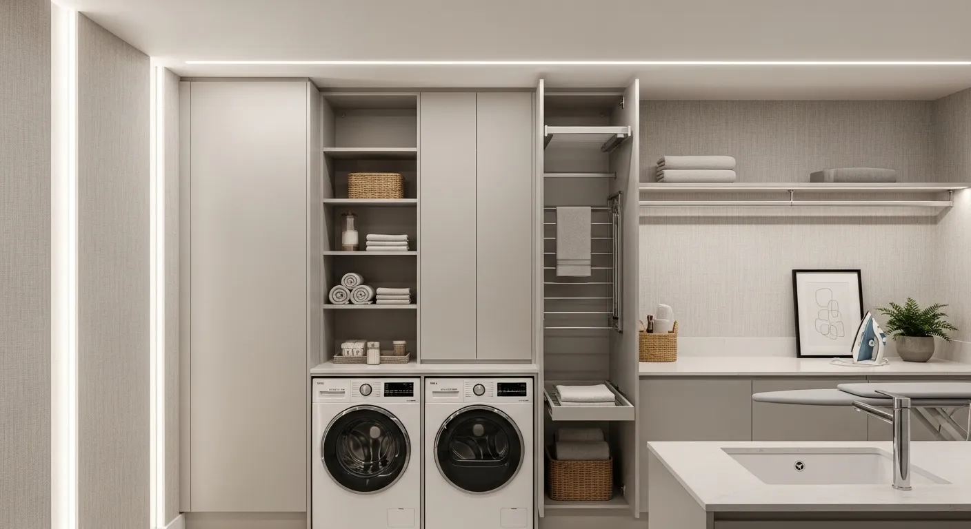 Lavanderias bem planejadas transformam a rotina. Na INOVARE, até os ambientes mais técnicos ganham beleza e inteligência com mobiliário feito sob medida. Utilizamos materiais resistentes, acabamentos sofisticados e soluções que otimizam o espaço. Nichos, armários e áreas de apoio tornam o ambiente prático, funcional e visualmente harmonioso.